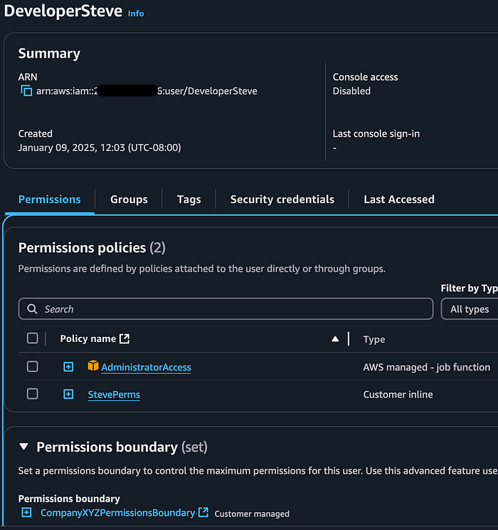 Steve is a developer for Company XYZ and needs to be able to create an IAM User and attach policies to that user. For simplicity, let’s say that Steve has an IAM User that he uses for his development activities and there is a Permissions Boundary applied directly to his User.
