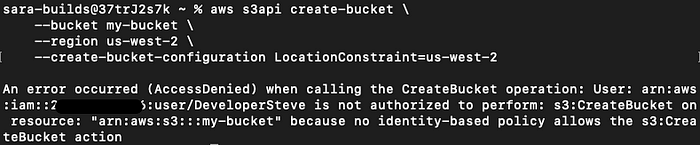 If Steve tries to run the same command to create a User now that he has the identity-based policy attached to his User, he will still get an error: